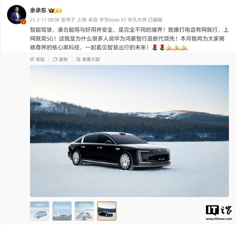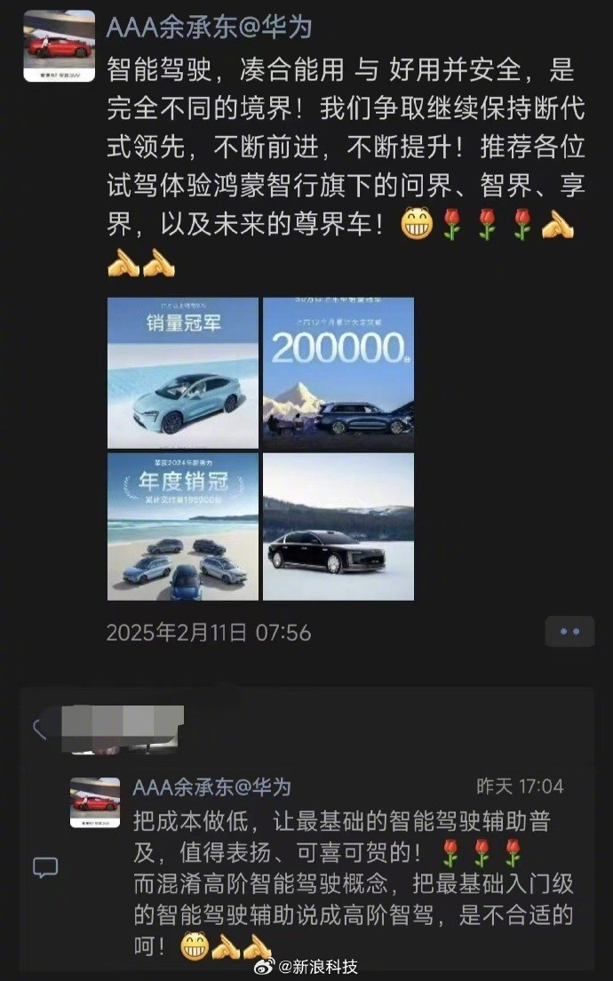IT之家 2 月 14 日消息,据新浪科技昨日消息,华为常务董事、终端 BG 董事长、智能汽车解决方案 BU 董事长余承东在朋友圈发文:“把成本做低,让最基础的智能驾驶辅助普及,值得表扬、可喜可贺的!而混淆高阶智能驾驶概念,把最基础入门级的智能驾驶辅助说成高阶智驾,是不合适的呵!”